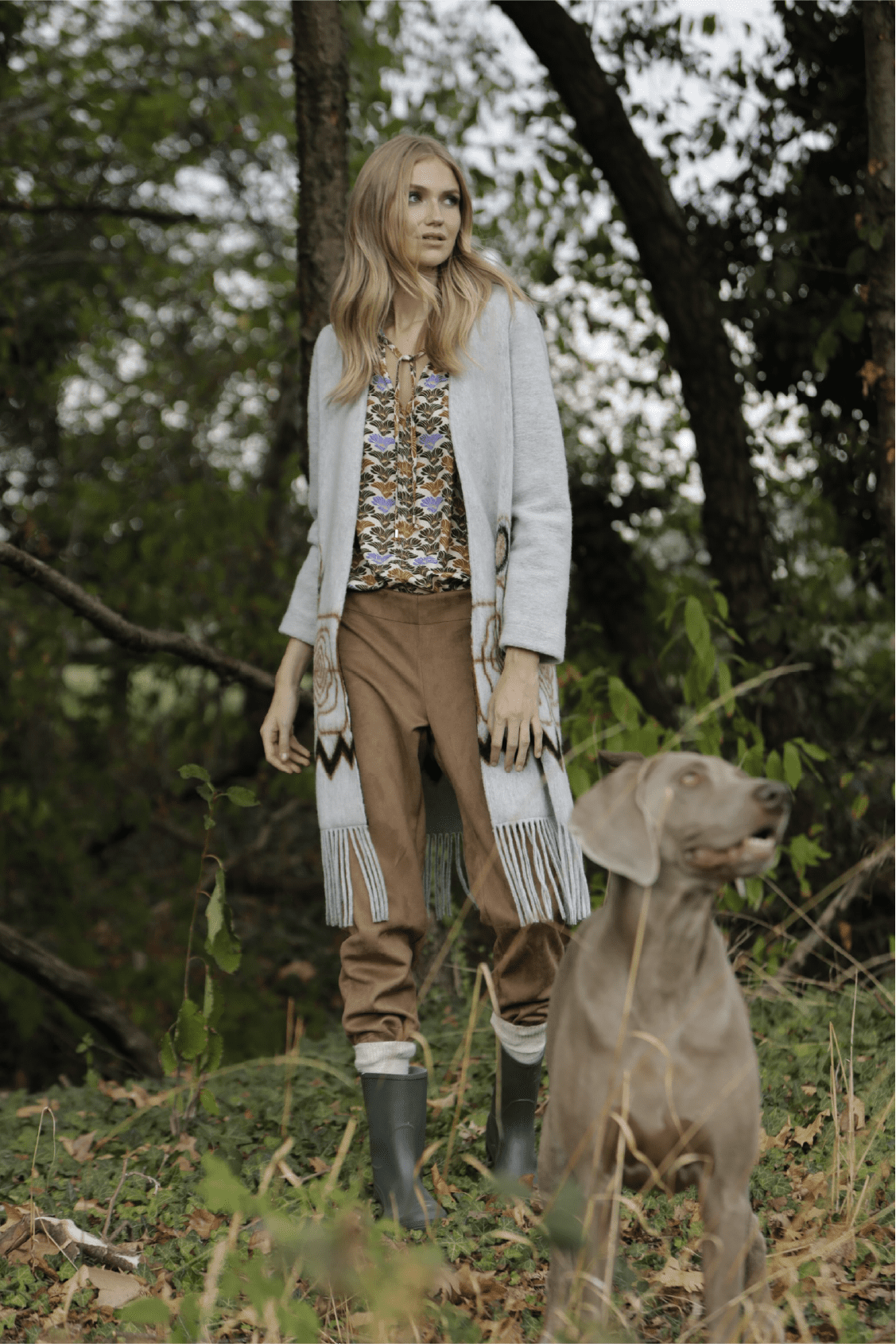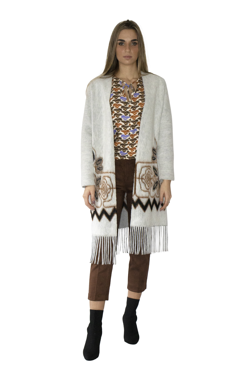 Maxi cardigan with fringes, placed design. Long sleeve, contrasting inner placket and belt.