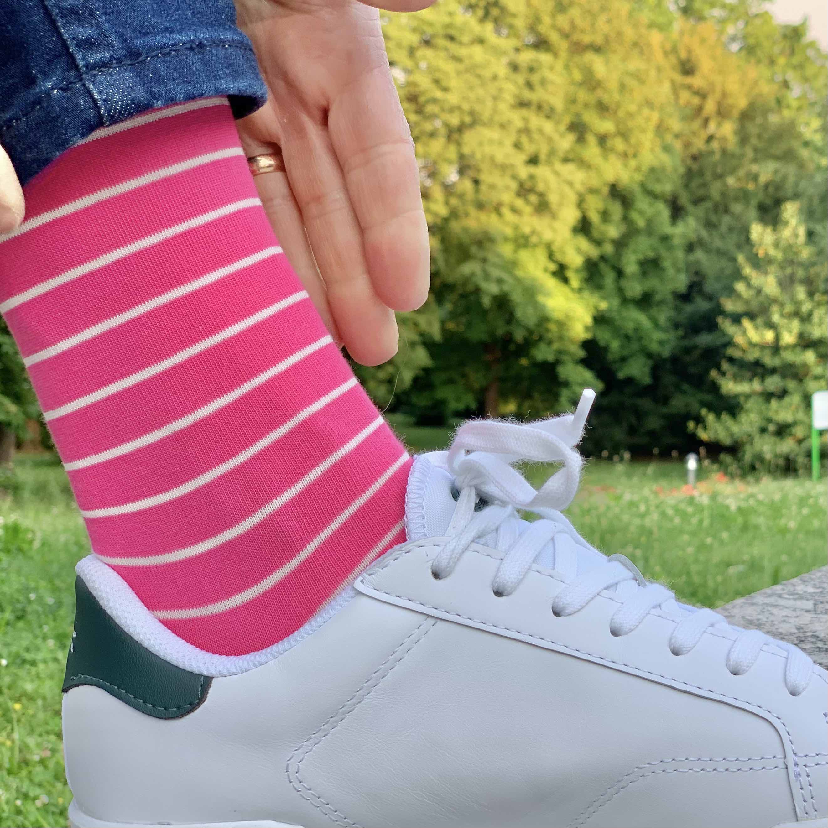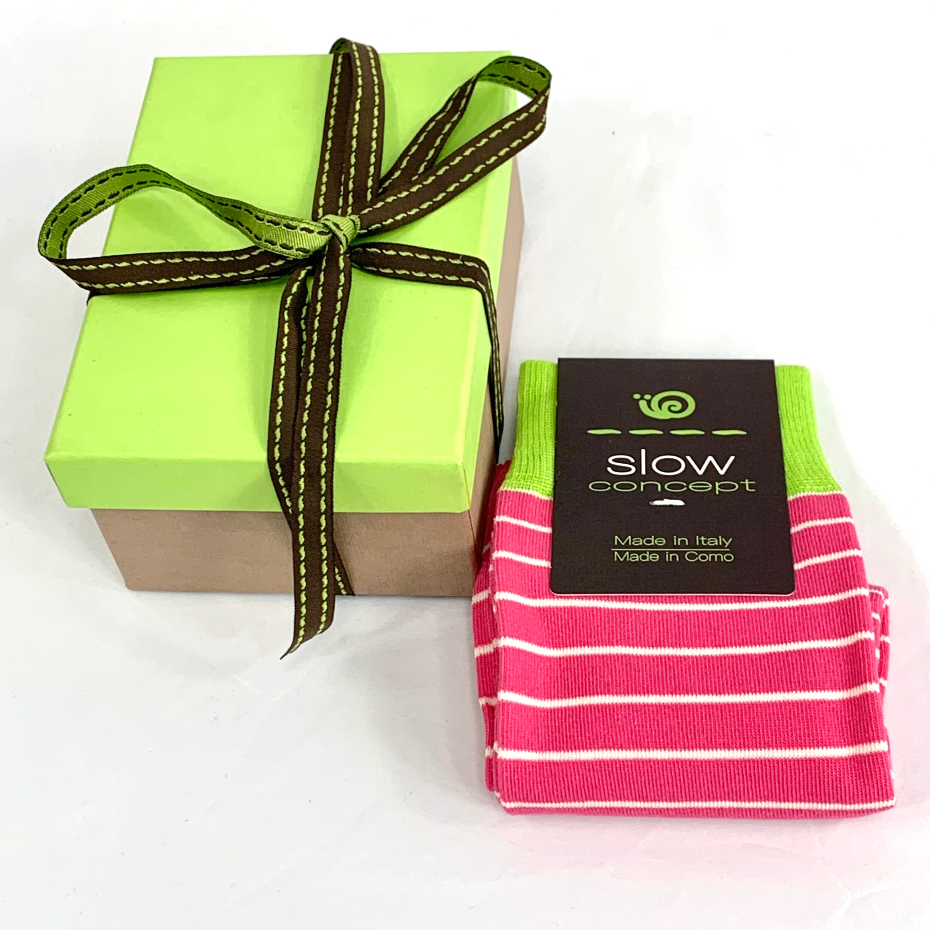 A pair of socks made in Italy, 85% cotton 12% polyamide 3% elastane, colour fuchsia with thin white stripe. Contrasting apple-green flounce.