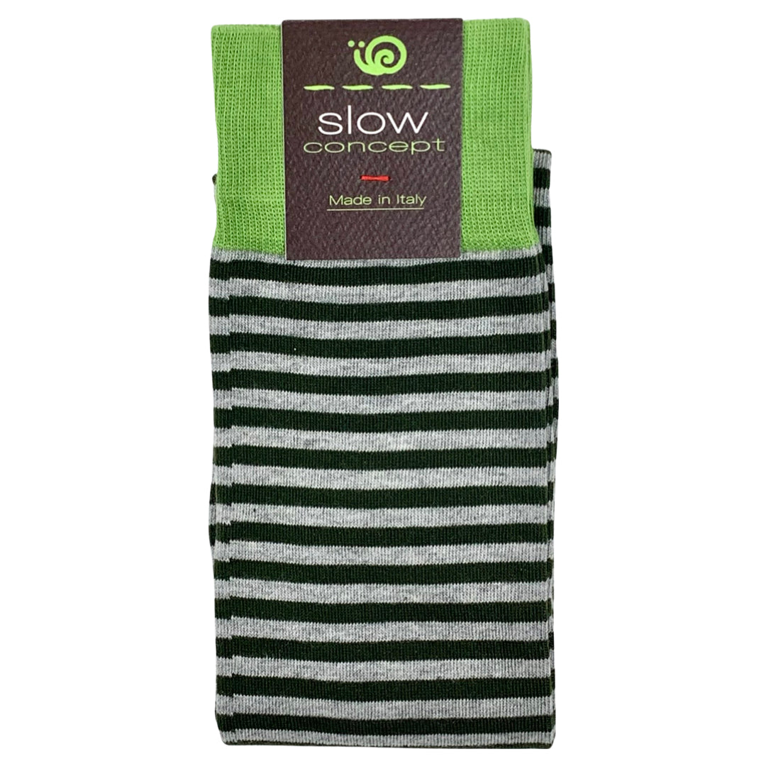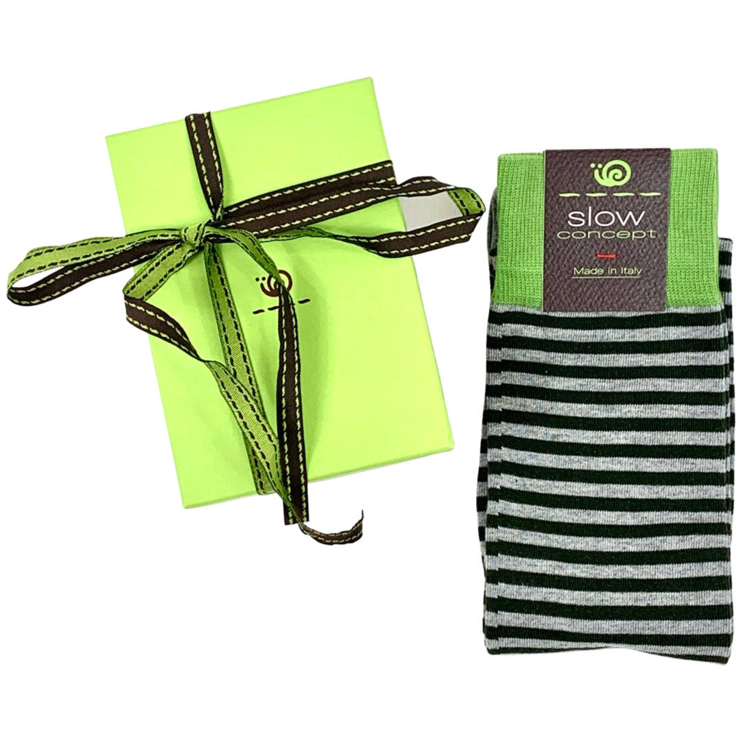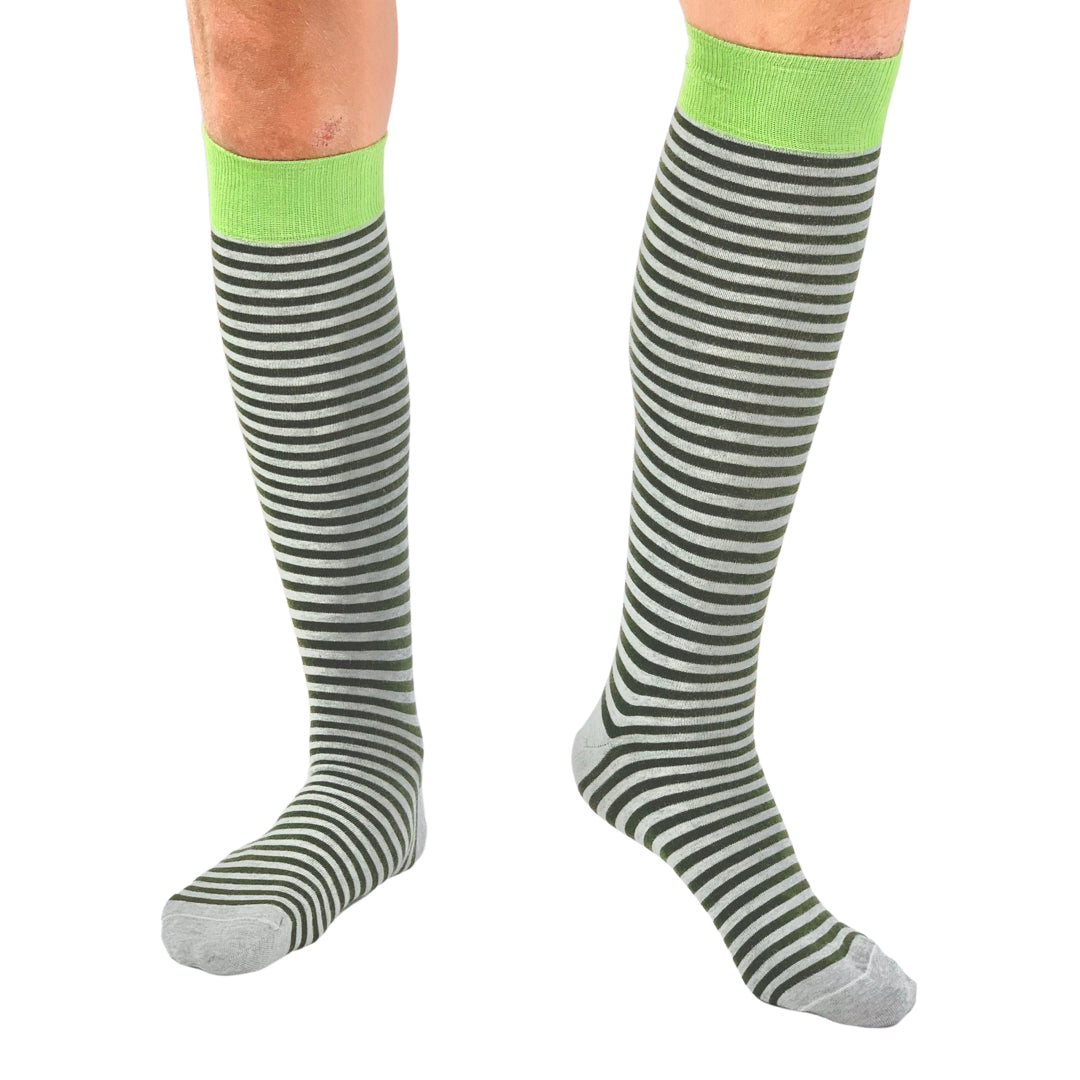 Italian knee socks 85% cotton 12% polyamide 3% elastane, two-color stripe design, with cuff of 6 cm green contrast.