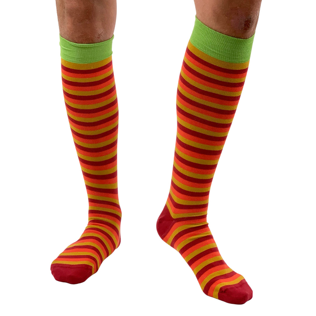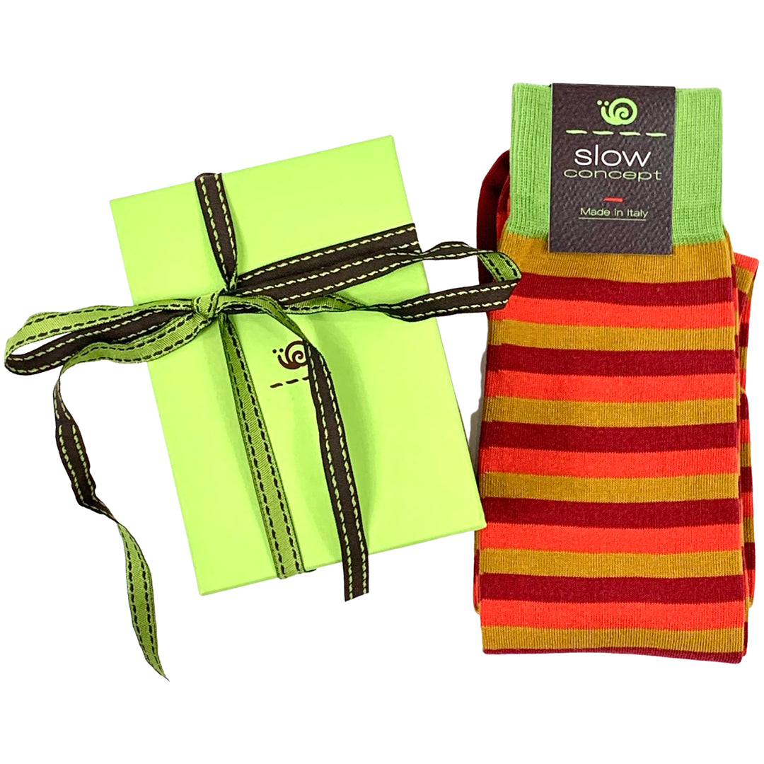 Stockings Italian knee-highs 85% cotton 12% polyamide 3% elastane, pattern equal row of 1 cm, gold, orange and wine, with cuff of 6 cm green contrast.