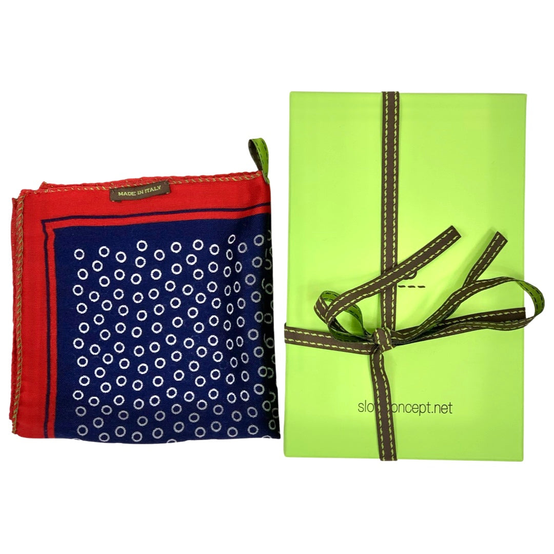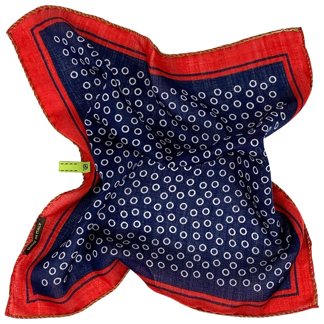 Pocket handkerchief in 100% printed wool, made in Italy. French hem with green contrasting thread