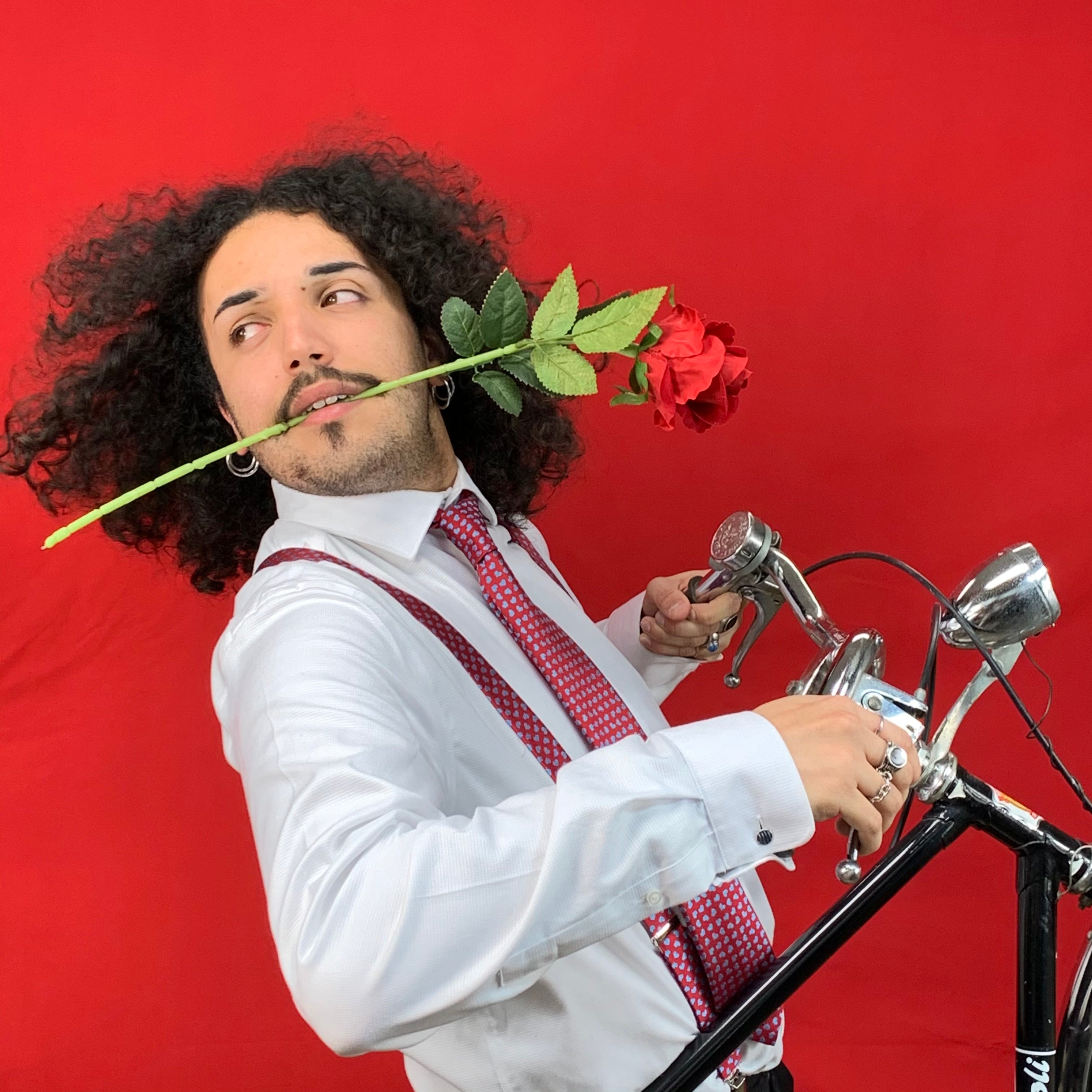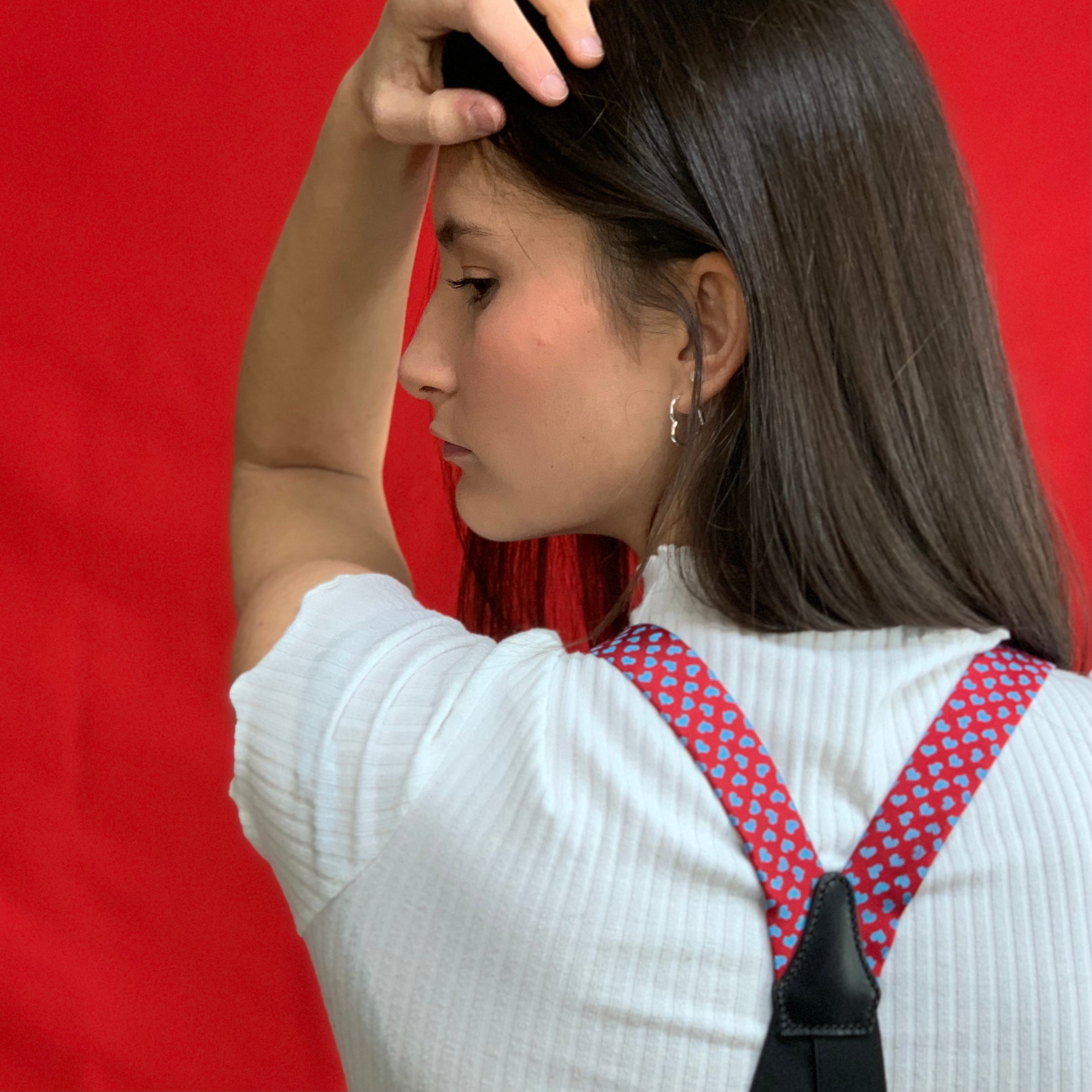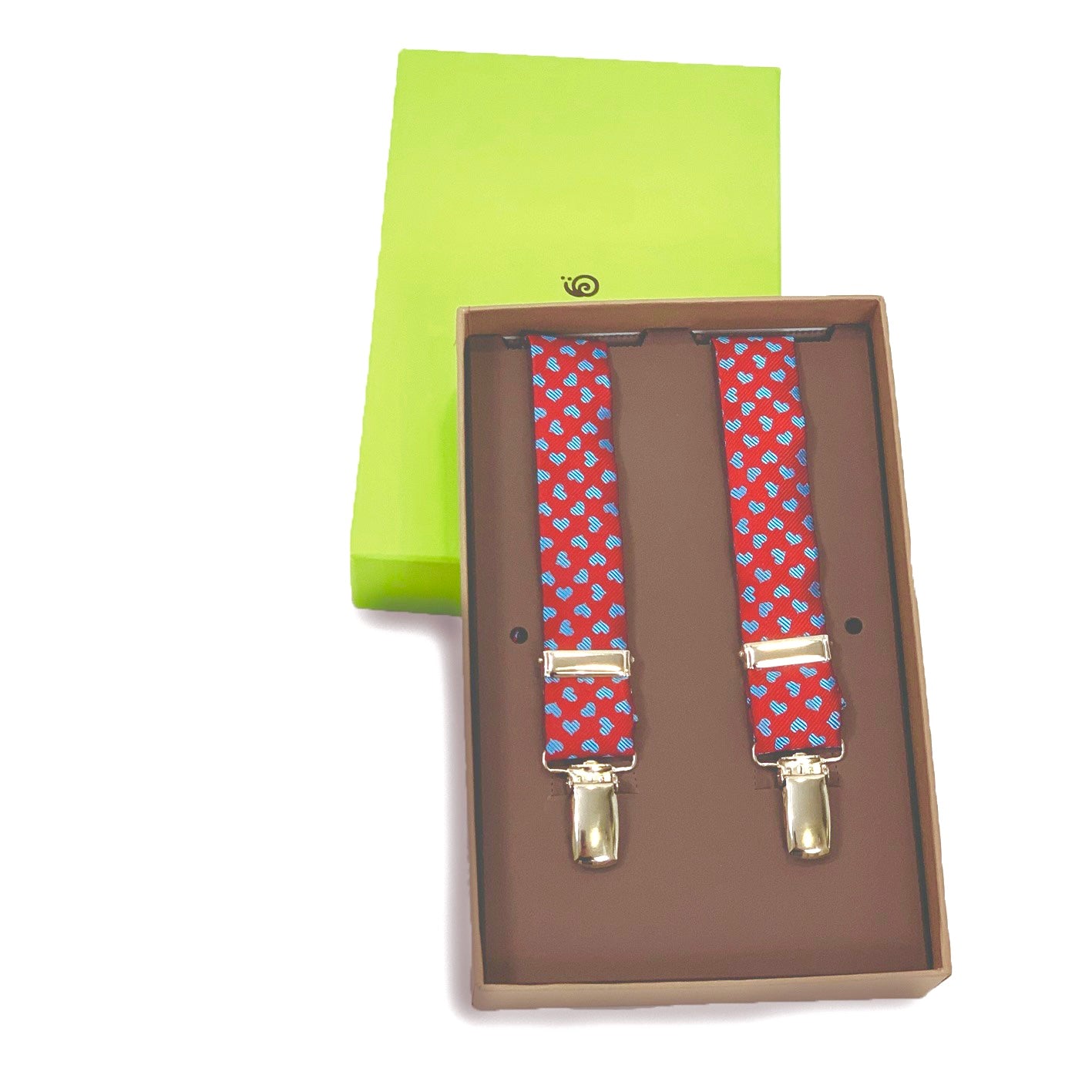 Red pure jacquard silk braces with light blue heart. Width of silk braces 2.5 cm. Made in Italy.