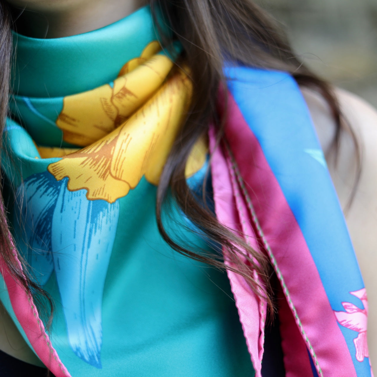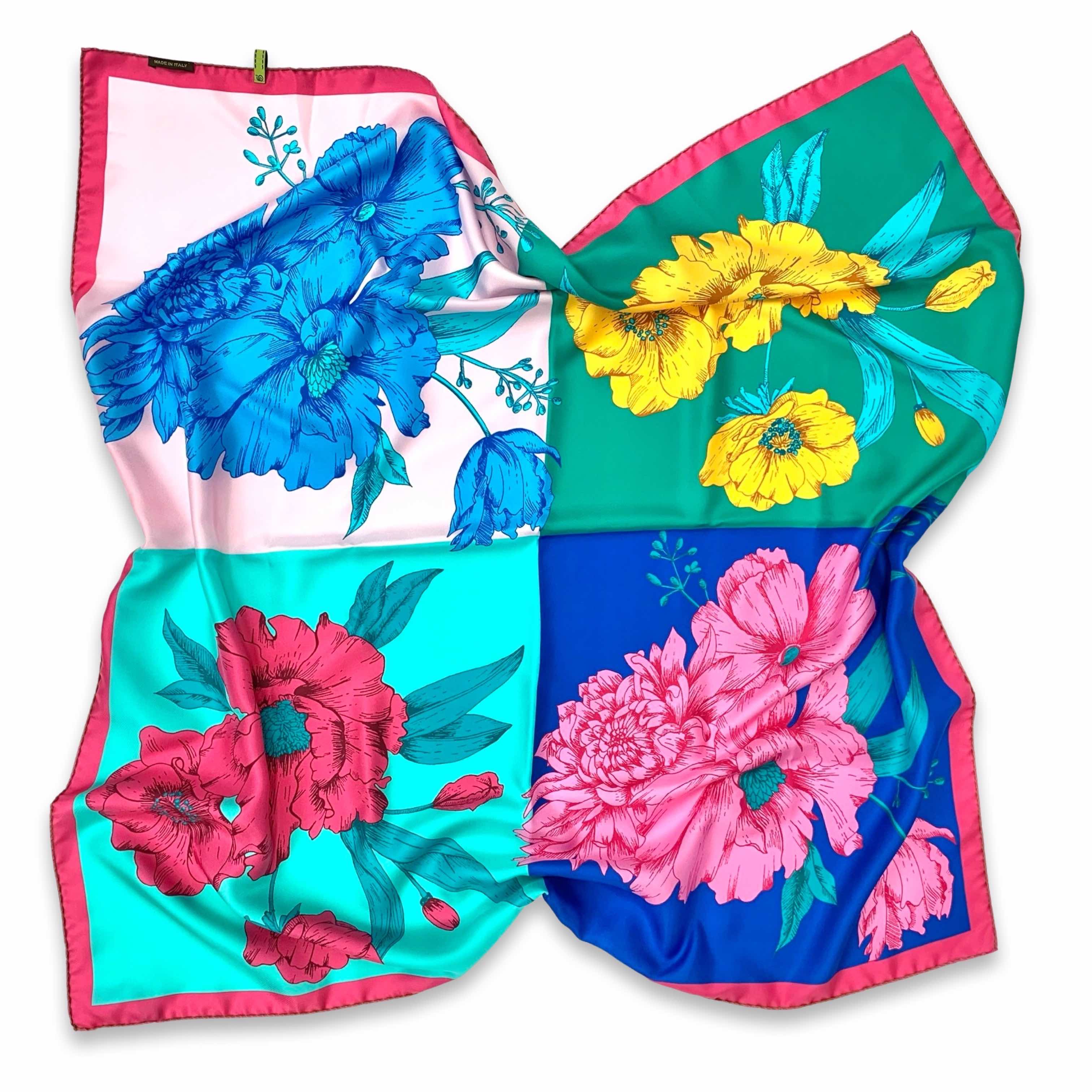 SCARF CM 90x90 PURE SILK FLOWER DESIGN POP GREEN AND BLUE