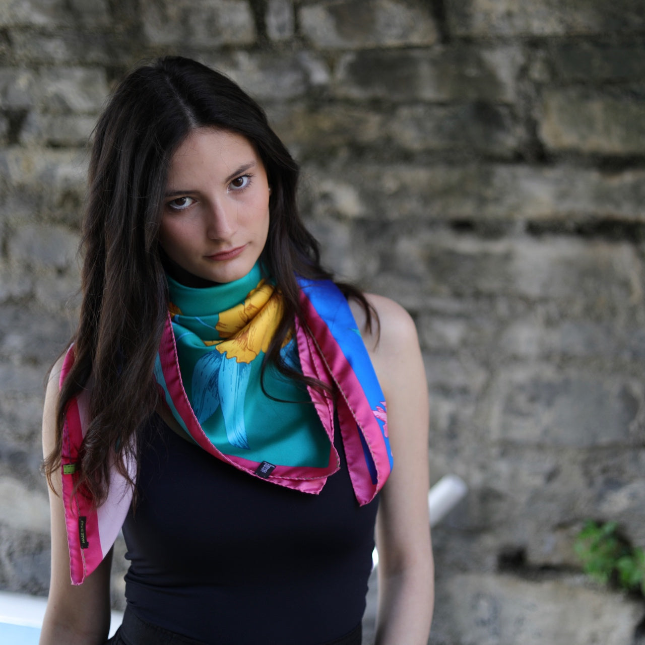 Scarf printed Made in Italy 100% silk, flower design Pop-Art pack French hemline green contrast.