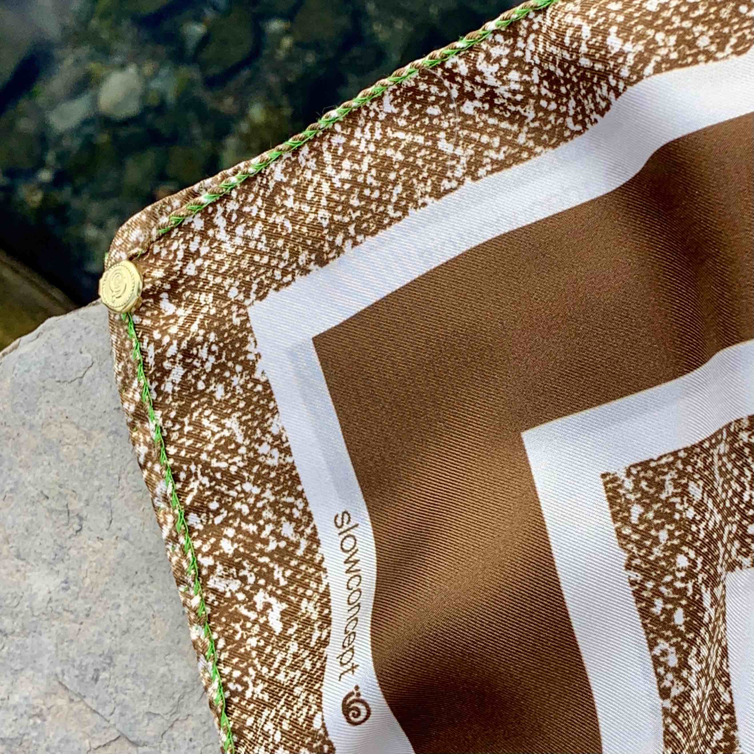 Printed Made in Italy 100% silk scarf, geometric design with contrasting green French hem.