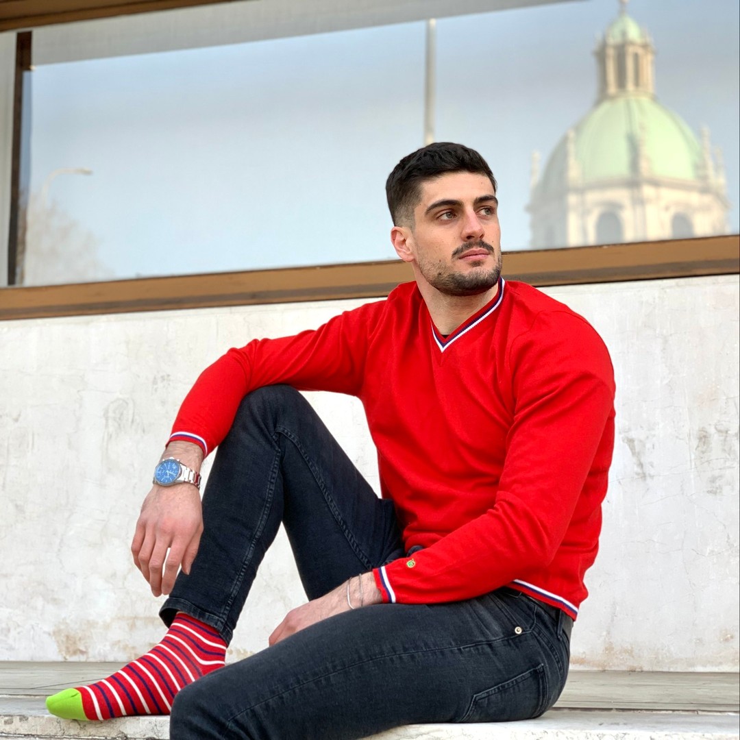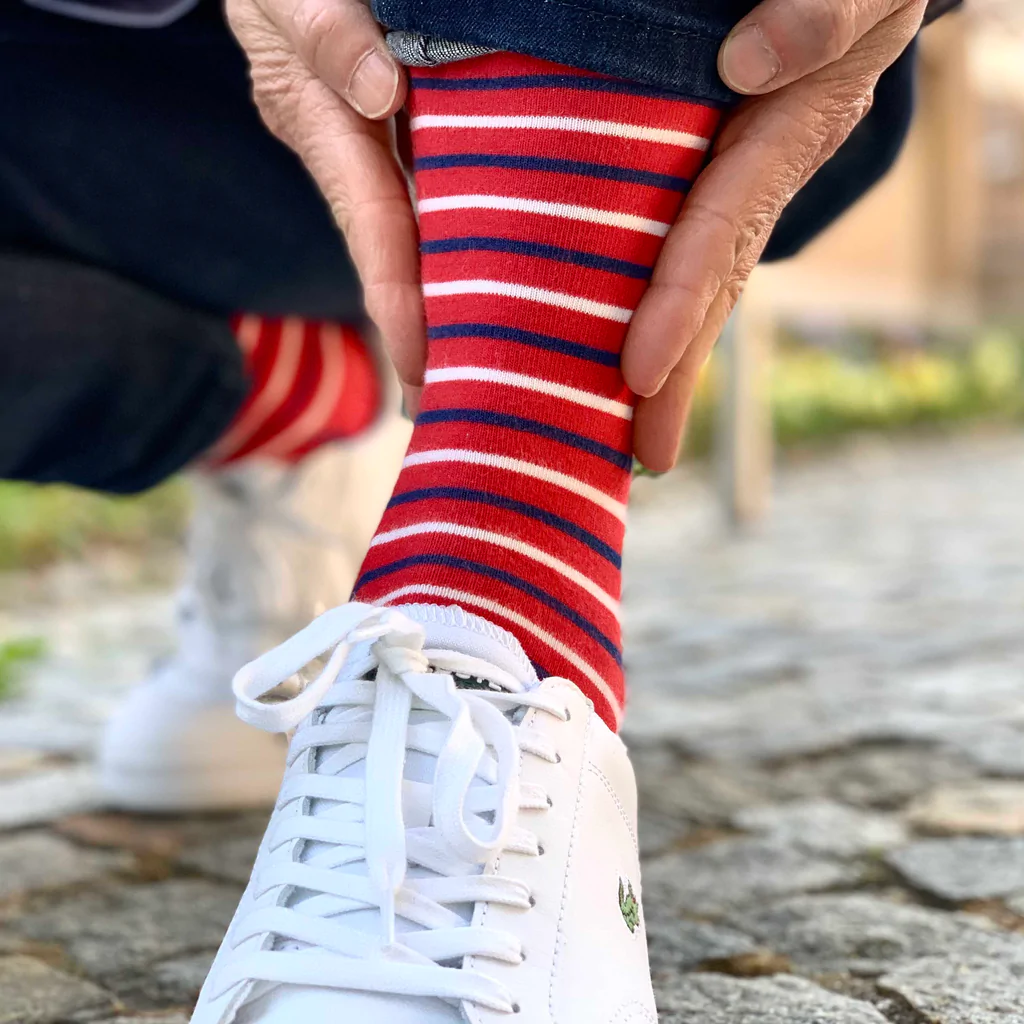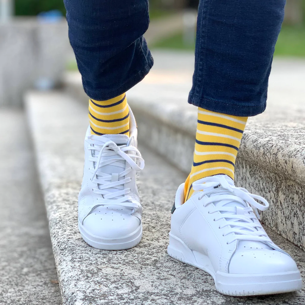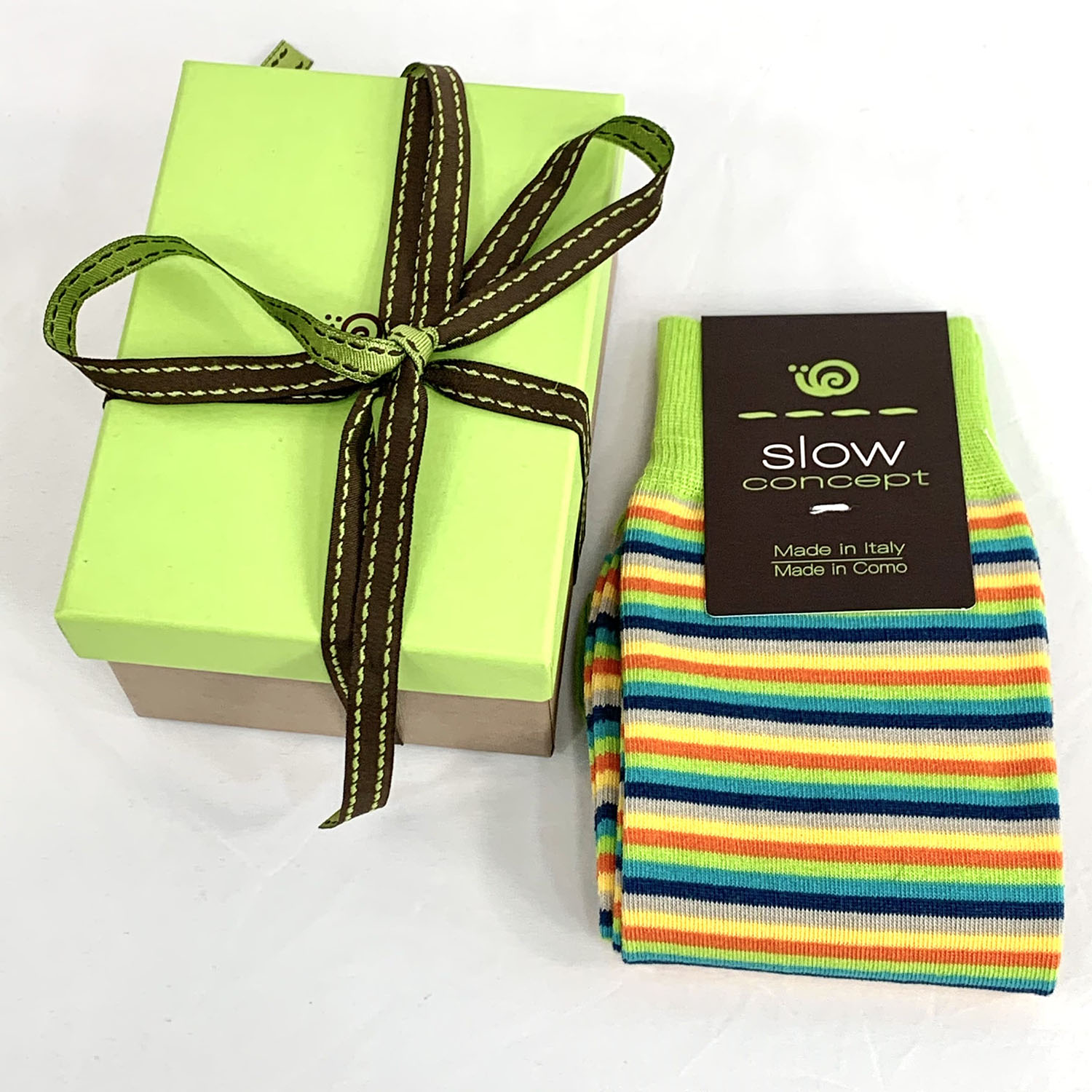 A pair of socks made in Italy, 85% cotton 12% polyamide 3% elastane, available in 3 versions: multicolour, yellow and red striped. Contrasting apple-green flounce and toe.