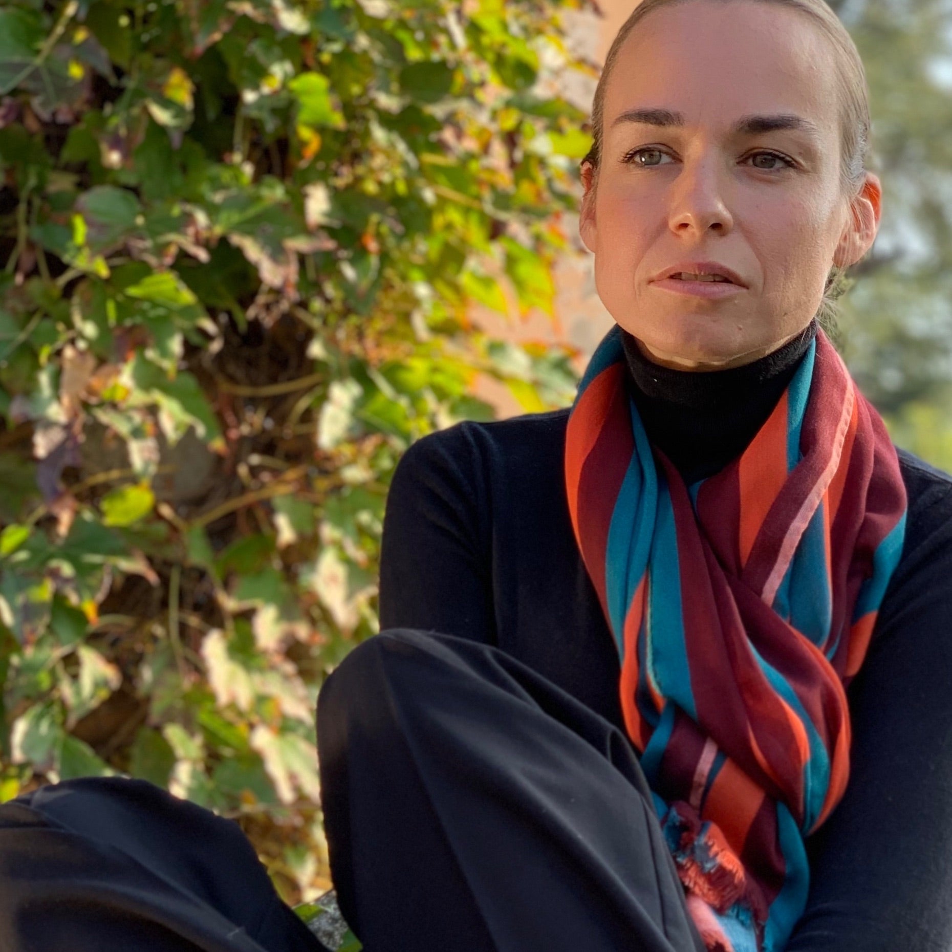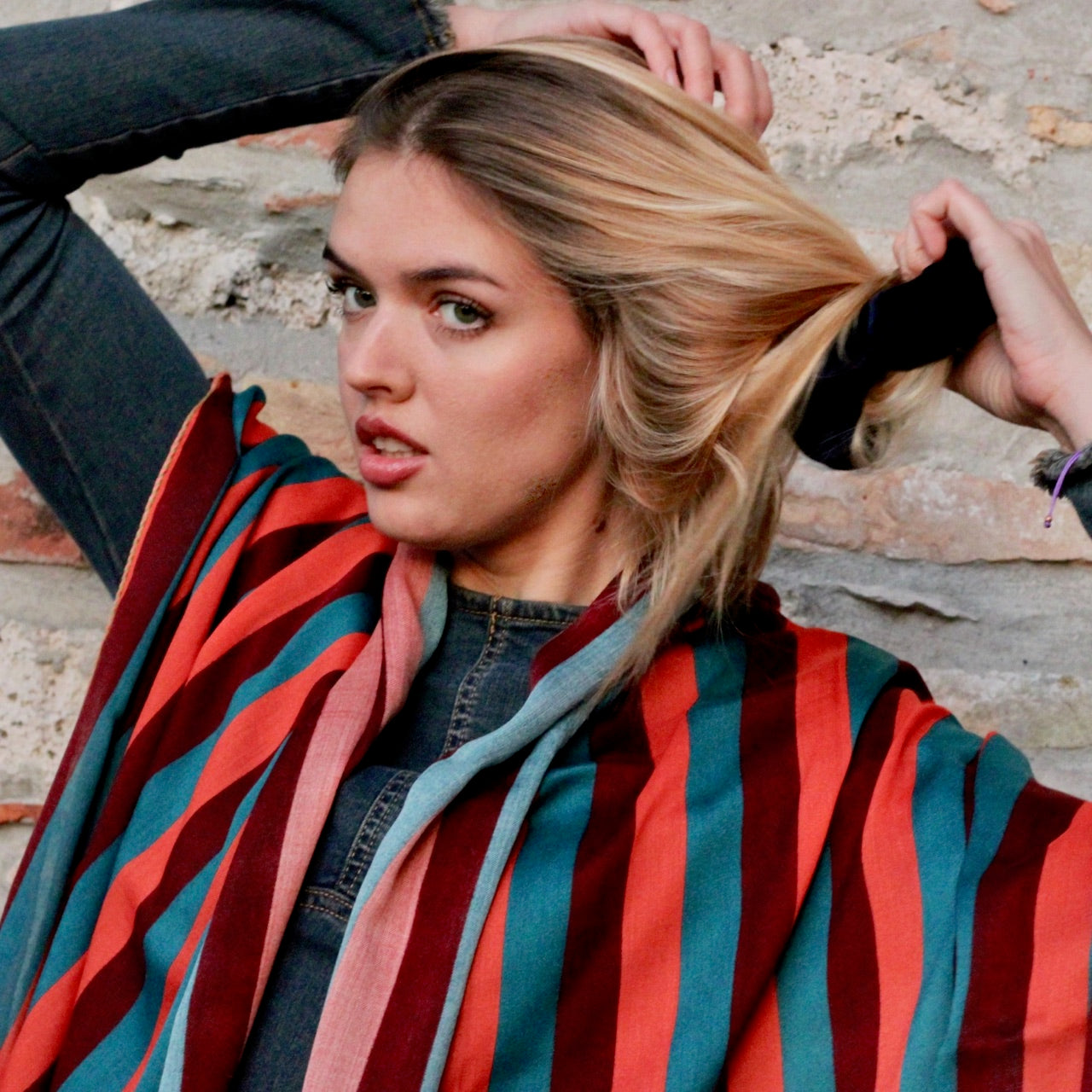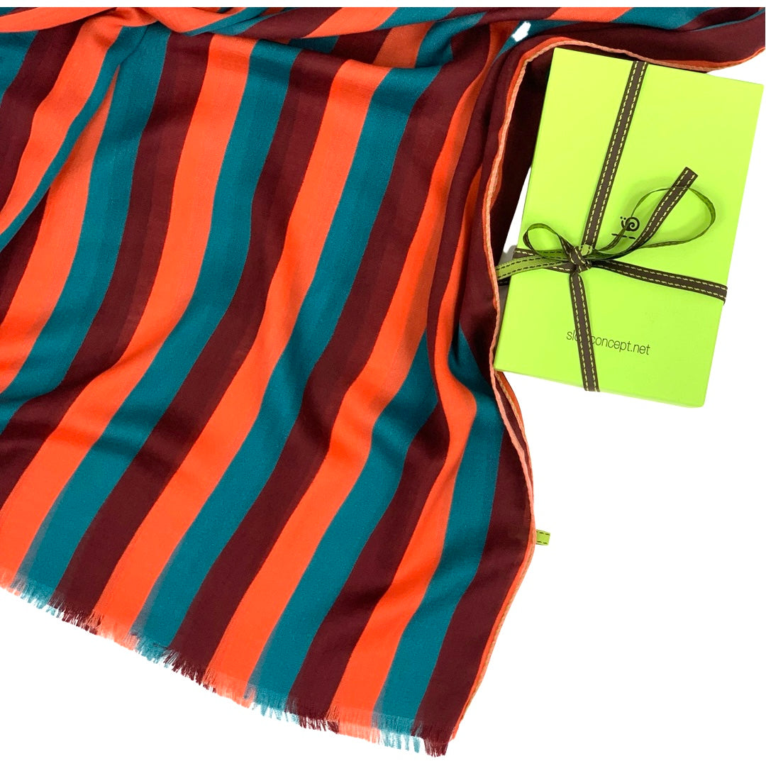 STOLE PURE WOOL PRINTED STRIPE RED, ORANGE, PETROLEUM