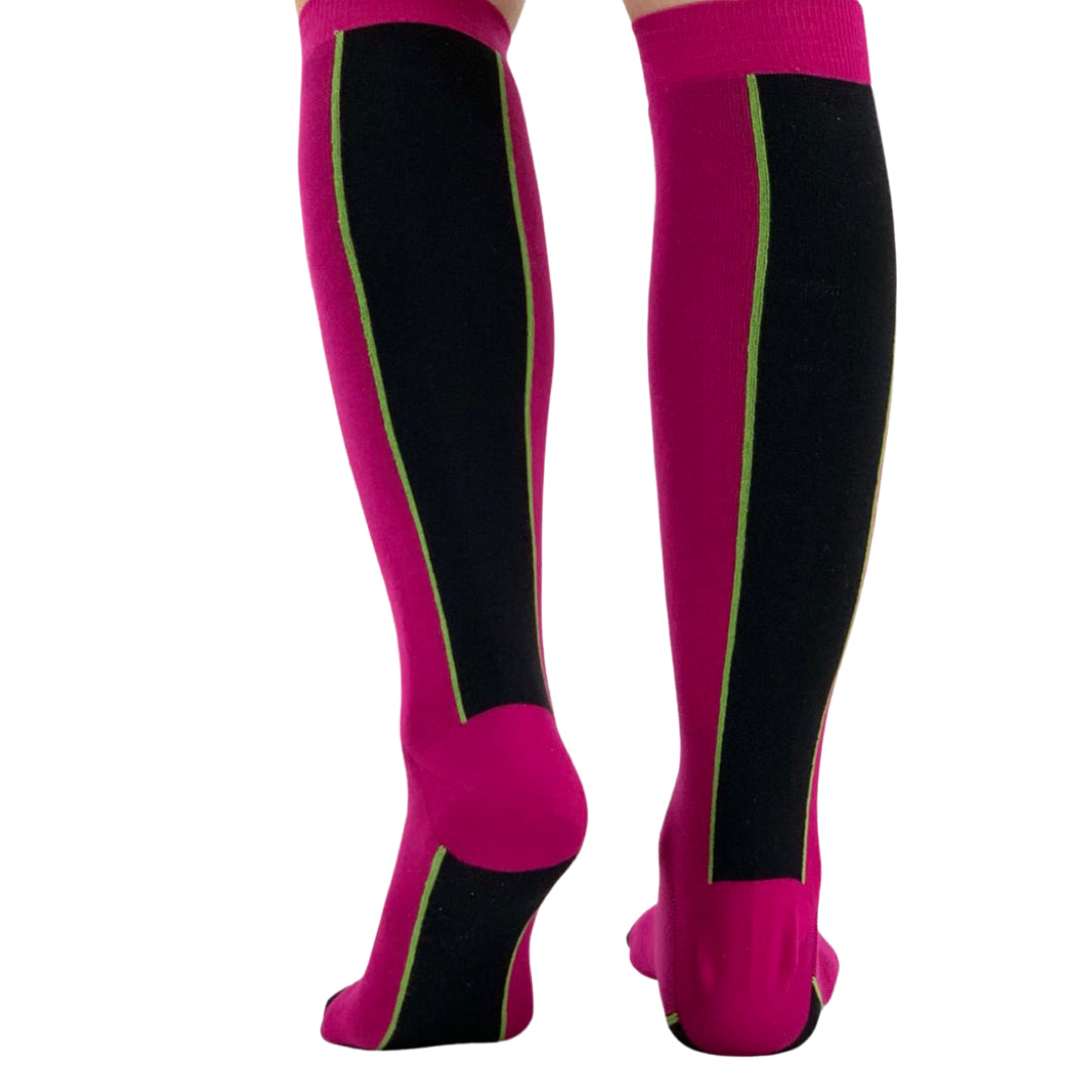 Calcetines altos italianos 85% algodón 12% poliamida 3% elastano, diseño de paneles bicolor, con puño de 6 cm a contraste en verde.