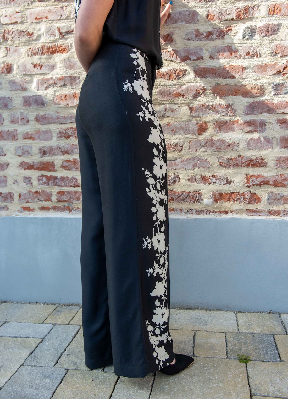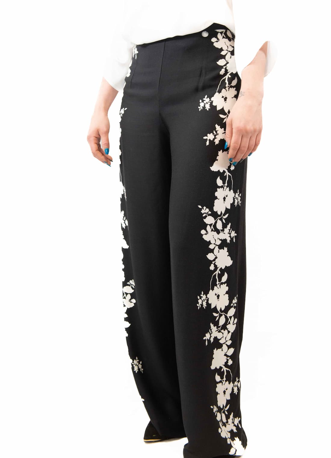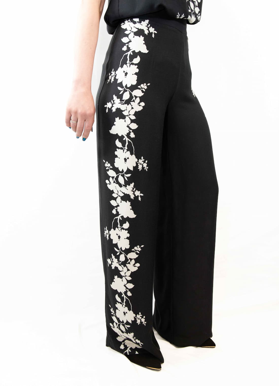 Pantalón palazzo de viscosa, negro con detalles de estampado floral blanco