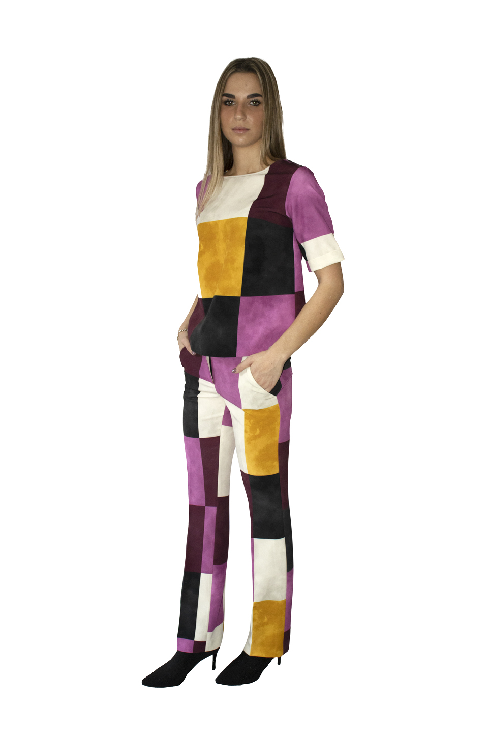 Pantalones de pierna recta con estampado macrosquare. Tejido bi-elástico. Cierre con botón y cremallera, trabillas en la cintura, bolsillos delanteros.