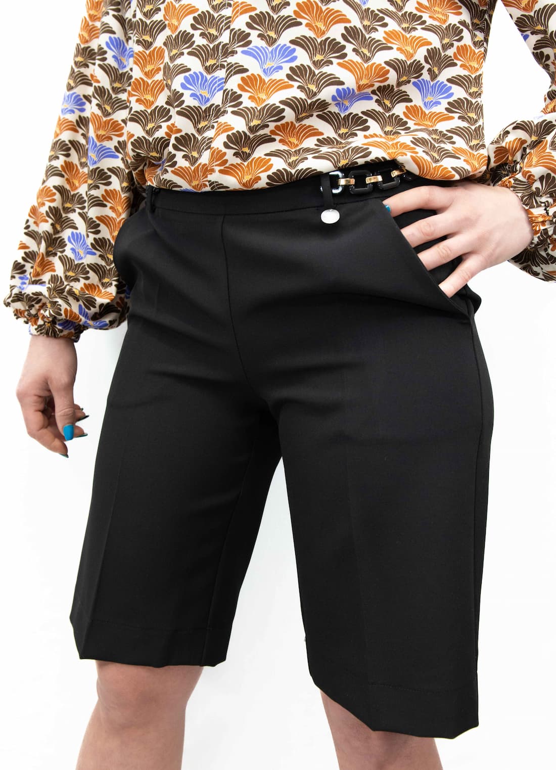 Bermuda en tejido bi-elástico, apertura con cremallera invisible en la espalda.